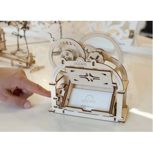 В готовом виде изделие имеет механизированные элементы: если покрутить шестеренку, то коробочка для хранения визиток плавно поднимется, а крышка на ней откроется. В коробочке удобно хранить визитные или банковские карты, максимальный размер которых 9 см на 5,5 см. Также подходит для различных канцелярских мелочей: булавок, скрепок, кнопок и прочие. Шкатулка UGEARS комплектуется двумя съемными панелями, одна из которых оборудована вырезом для карты.